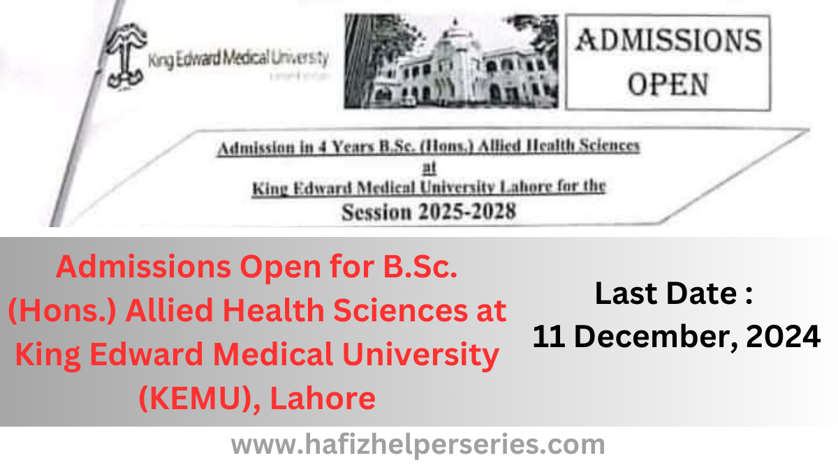 King Edward Medical University (KEMU), a prestigious institution in Pakistan, has announced admissions for its 4-year B.Sc. (Hons.) Allied Health Sciences programs for the session 2025-2028. This is a golden opportunity for aspiring students to join the field of allied health sciences and build a bright career in healthcare.KEMU Admissions 2024