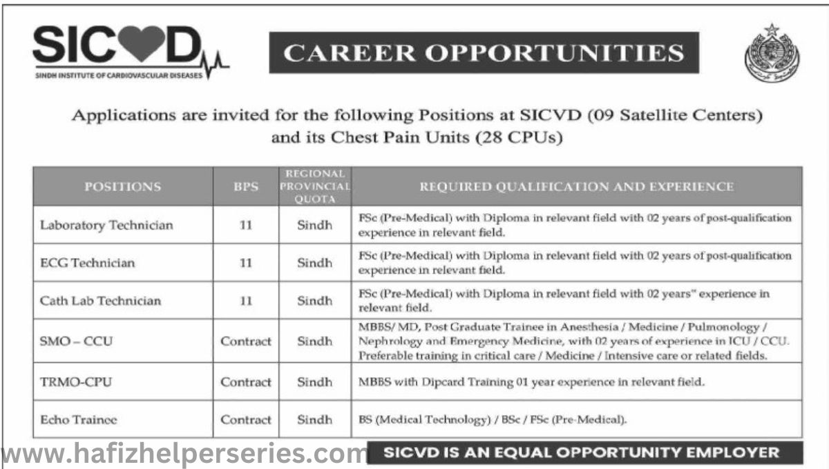 Are you looking to build a rewarding career in the healthcare sector? The Sindh Institute of Cardiovascular Diseases (SICVD) is inviting applications for various positions at its 9 Satellite Centers and 28 Chest Pain Units (CPUs). This is your chance to join a prestigious institution dedicated to providing top-notch cardiovascular care in Pakistan.