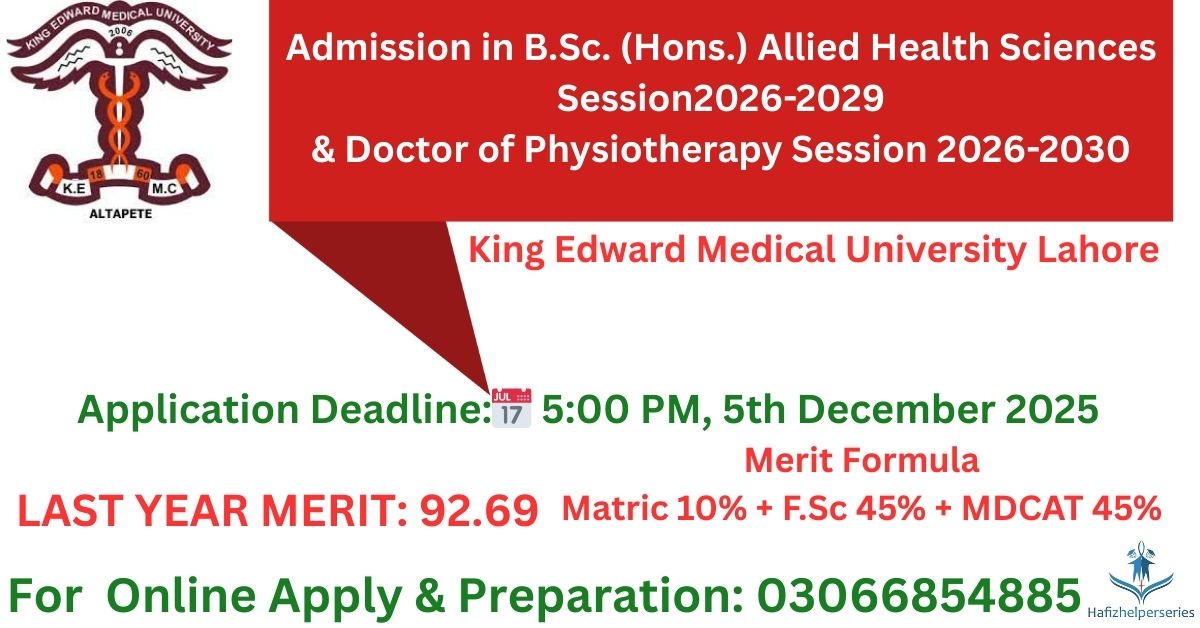King Edward Medical University (KEMU), Lahore – one of Pakistan’s top medical institutions invites applications for various Allied Health Sciences programs and Doctor of Physiotherapy (5-year program),KEMU Admissions 2025.