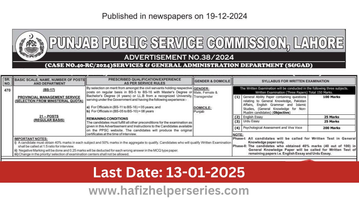 The Punjab Public Service Commission (PPSC), Lahore, invites applications for Advertisement No. 38/2024. This guide provides an overview of the Provincial Management Service (Selection from Ministerial Quota) under the Services & General Administration Department (S&GAD).